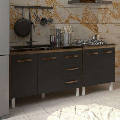 Armário Cozinha Gabinete Pia de 120 cm Bruna e Balcão Fran para Cooktop 5 Bocas Savana Preto