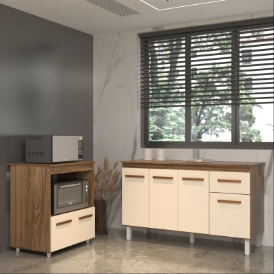 Armário Gabinete Camila 138 cm com Tampo Tampão e Balcão Amanda para Forno e Microondas Savana e Off White