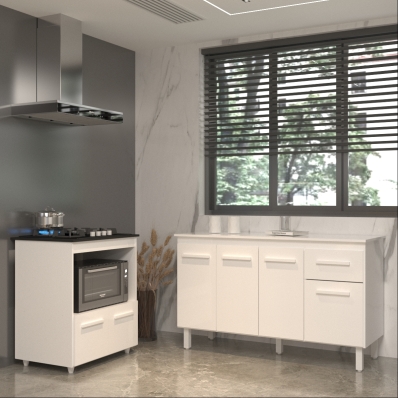 Armário Gabinete Camila 138 cm com Tampo Tampão e Balcão Evelyn Para cooktop 4 Bocas Branco