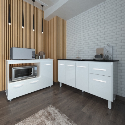 Balcão Armário Camila Cozinha Gabinete de Pia 140 cm e Balcão para Forno Elétrico e Microondas Lilian Branco