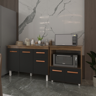 Balcão Armário Gabinete Aline 118 cm Savana Preto com Tampo Savana e Balcão Amanda para Forno e Microondas Savana Preto
