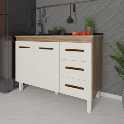 Balcão Armário Gabinete Para Pia de Cozinha 118 cm Bruna 2 Portas e 3 Gaveta Savana Off White