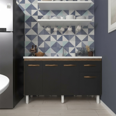 Balcão Cozinha Armário Gabiente Pia de 140 cm com 4 Portas e 1 Gavetas Camila Savana Preto