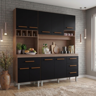 Cozinha Compacta Vivian 180cm 9 Portas e 4 Gavetas Savana e Preto Mobília Decor
