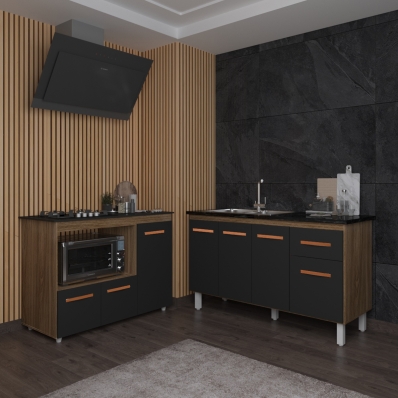 Armário Camila Cozinha Gabinete de Pia 140 cm e Balcão para Cooktop 4 Bocas e Forno ou Microondas Alana Savana Preto