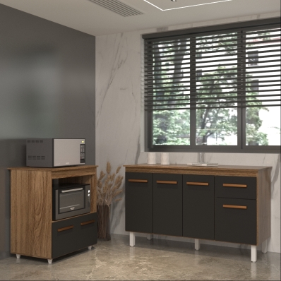 Armário Gabinete Camila 138 cm com Tampo Tampão e Balcão Amanda para Forno e Microondas Savana com Preto