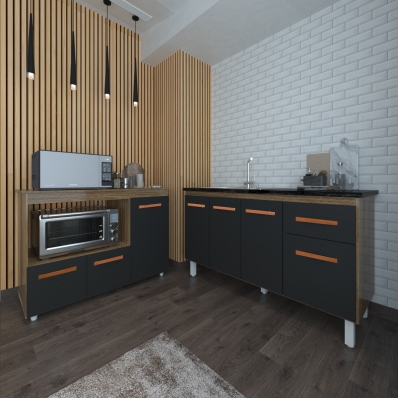 Balcão Armário Camila Cozinha Gabinete de Pia 140 cm e Balcão para Forno Elétrico e Microondas Lilian Savana Preto