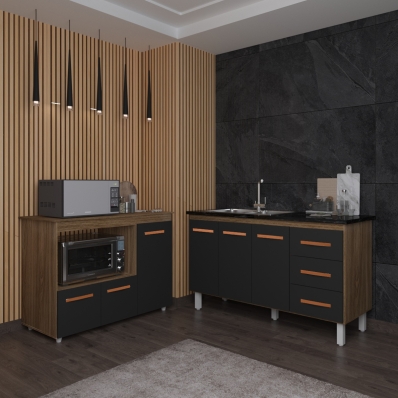 Balcão Armário Cozinha Carine Gabinete de Pia 140 cm e Balcão Lilian para Forno Elétrico e Microondas Savana Preto