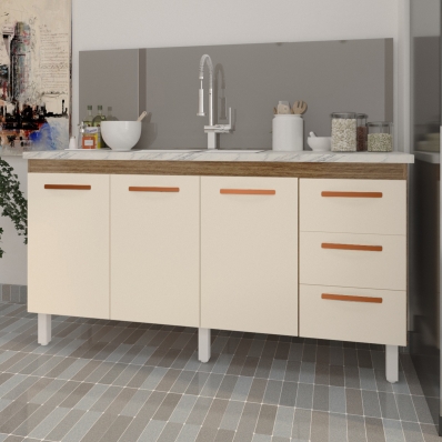 Balcão Armário Cozinha Gabinete para Pia 148 cm 3 Gavetas e 3 Portas Deise Savana Off White