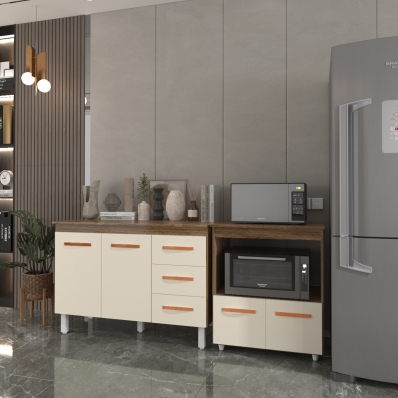 Balcão Armário Gabinete Bruna 118 cm Savana Off White com Tampo Savana e Balcão Amanda Forno Microondas Savana Off White