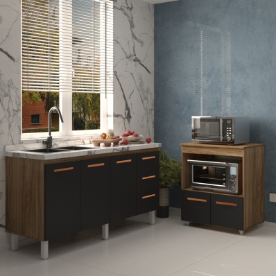 Balcão Cozinha Armário Gabinete de Pia 160 cm Estela e Balcão para Forno Elétrico e Microondas Amanda Savana Preto