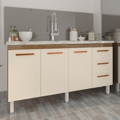 Balcão Cozinha Armário Gabinete para Pia 157 cm 3 Portas e 3 Gavetas Estela Savana Off White
