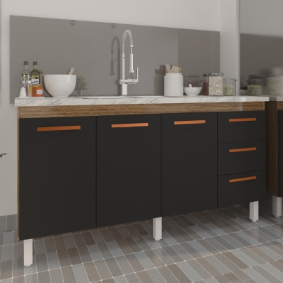 Balcão Cozinha Armário Gabinete para Pia 157 cm 3 Portas e 3 Gavetas Estela Savana Preto