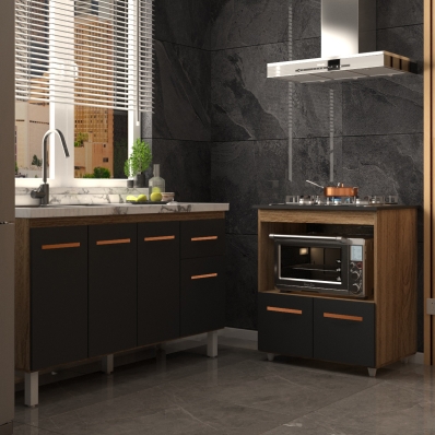 Balcão Cozinha Gabinete de Pia 140 cm Camila e Balcão Evelyn Para Fogão Cooktop 5 Bocas e Forno Elétrico Savana Preto