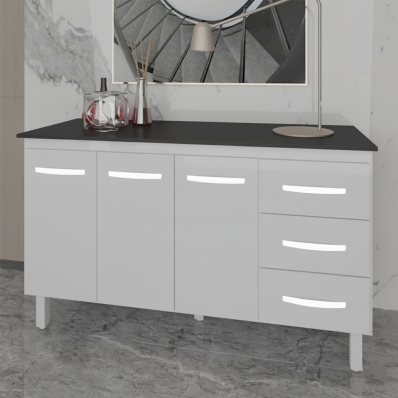 Balcão Gabinete Armário Cozinha Carine Branco com Tampo Tampão 140 cm Mobília Decor Preto