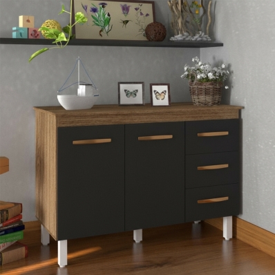 Balcão Gabinete Para Pia 118 cm Cozinha Bruna Savana Preto com Tampo Tampão 120 cm Savana