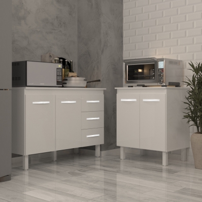 Balcão Para Microondas ou Forno Branco e Armário Bruna 118 cm Cozinha Gabinete Branco com Tampo Tampão Branco
