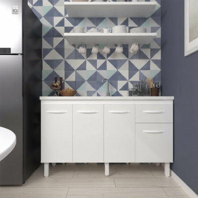 Balcão Cozinha Armário Gabiente Pia de 140 cm com 4 Portas e 1 Gavetas Camila Branco