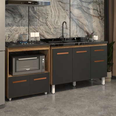 Cozinha Armário Balcão Gabinete de Pia Aline 120 cm e Balcão Evelyn para Fogão Cooktop 5 Bocas e Forno Savana Preto