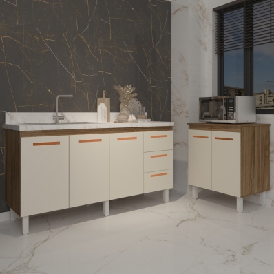 Conheça o Kit Balcão de Pia 150 cm + Balcão para Microondas ou Forno Elétrico, a solução ideal para quem deseja unir praticidade e elegância na cozinha. Com um design contemporâneo, o balcão de pia oferece 3 portas e 3 gavetas, garantindo amplo espaço para organizar seus utensílios. O balcão para cooktop possui duas portas, proporcionando uma cozinha mais funcional e eficiente. Produzido em MDP, com puxadores s e pés reguláveis, esse conjunto traz durabilidade e estilo, além de fácil nivelamento para qualquer ambiente.