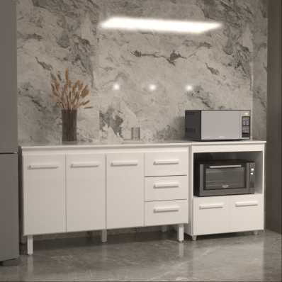 Gabinete Armário Carine 138 cm com Tampo Tampão e Balcão Amanda para Forno e Microondas Branco