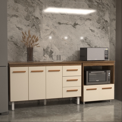 Gabinete Armário Carine 138 cm com Tampo Tampão e Balcão Amanda para Forno e Microondas Savana e Off White