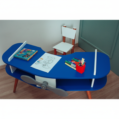 Mesa Avião Azul com Cadeira e Hélice e Pés Palito Design Criativo Mesa Desenho Quarto Menina Menino Infantil Decor